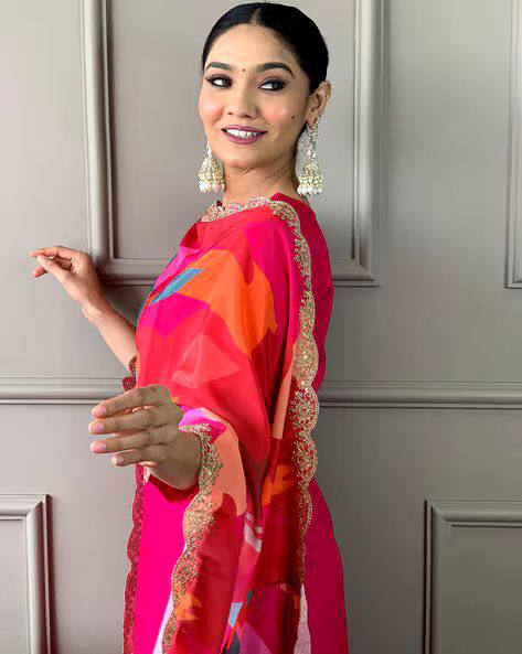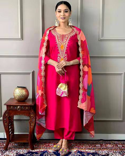 • Turn heads with Bhoomi, a rich and radiant ethnic suit set made from premium Roman Mull fabric. Designed for the modern woman who loves tradition with a twist, this set features exquisite embroidery along the neckline, paired with a vibrant multicolored dupatta that adds flair and charm to your look.